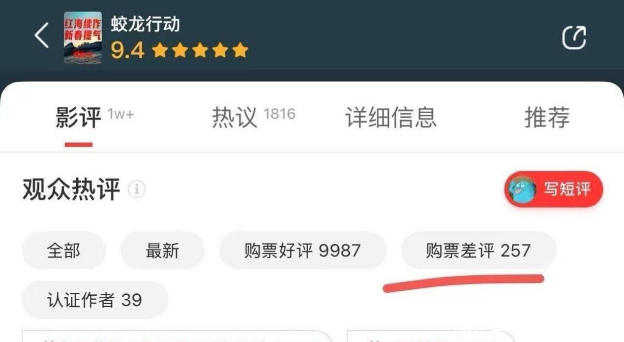 接下来是《蛟龙行为》,好评1w+,购票差评只消257条,质地轶群。