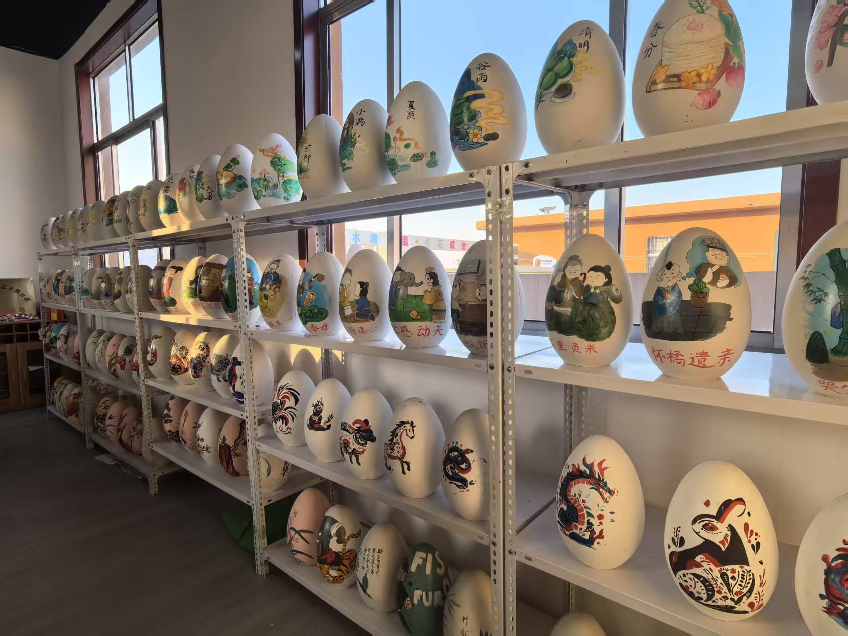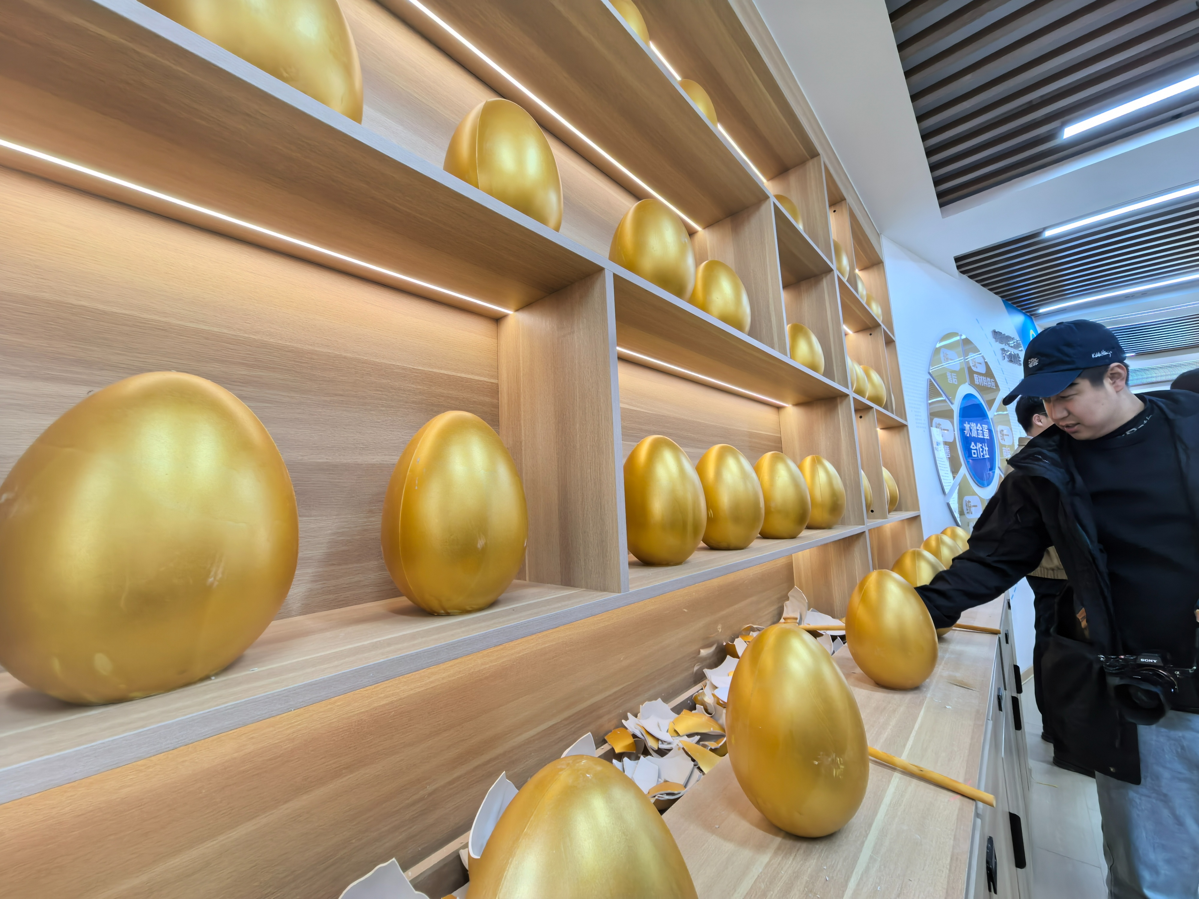 有砸金蛋的,就得有分娩金蛋的。走进上冶镇水湖金蛋创意产业园,摆满金蛋的晾货架排满整院,一个个黄灿灿的金蛋格外显眼。这里是我国最大的金蛋分娩地。