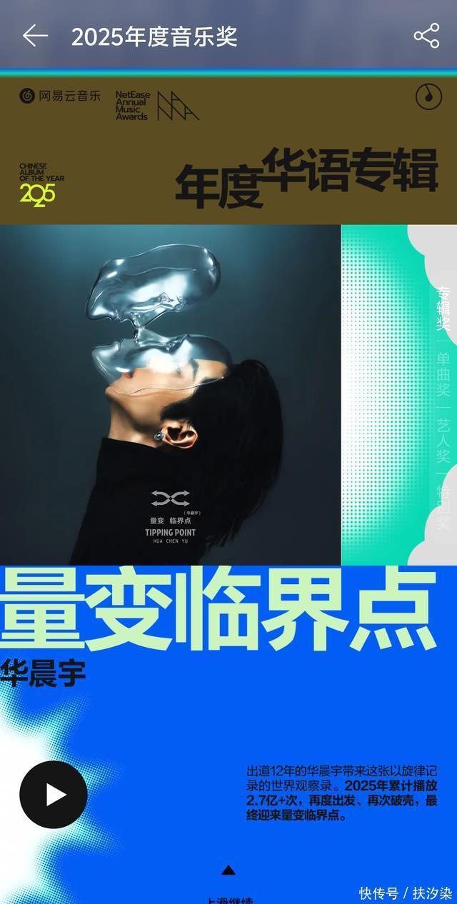 而华晨宇的第六张专辑《量变临界点》不仅拿下了年度华语专辑奖项,更同期摘得年度热点专辑TOP1与年度畅销数字专辑TOP1,已毕“三冠王”的冷漠树立。