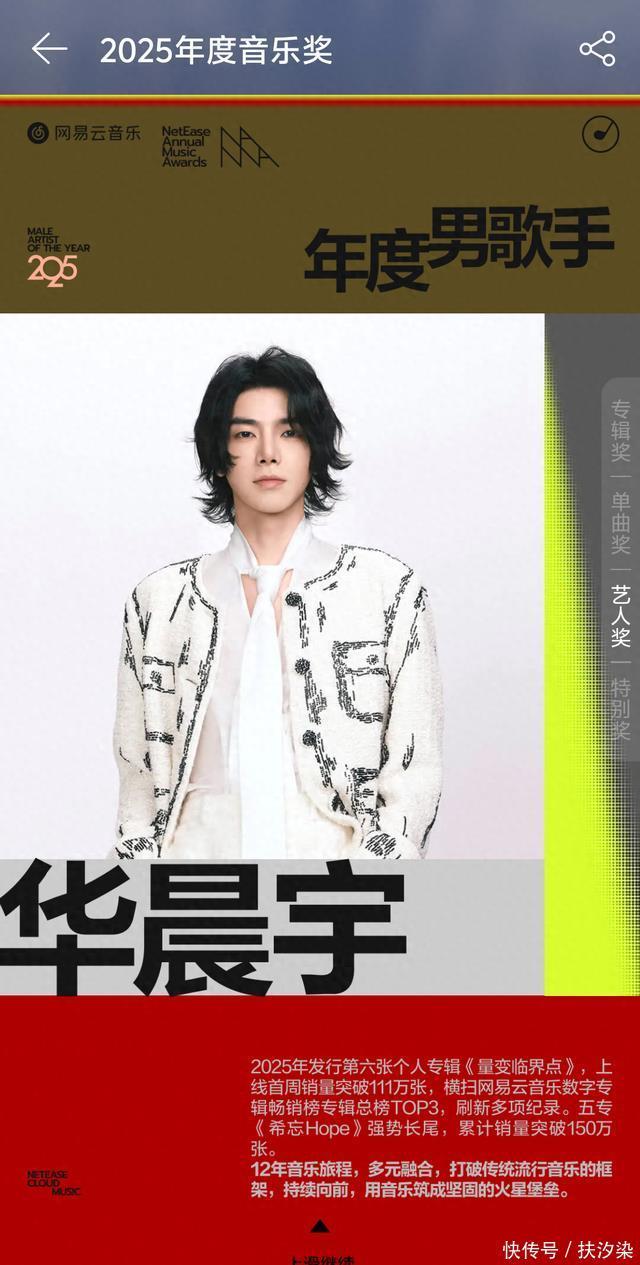 12月17日,网易云音乐2025年度音乐奖揭晓,华晨宇以“表象级总揽力”成为最大赢家——从个东说念主荣誉到作品收获,他简直包揽了网易云音乐最具重量的年度奖项,用实力诠释了“霸榜”二字的重量。