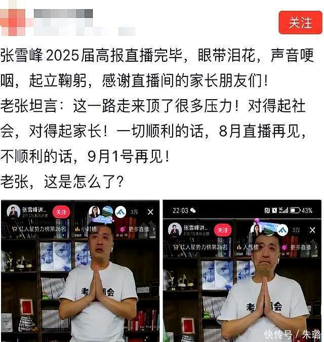 一向以节拍紧凑、信息量大和幽默敬爱著称的张雪峰,在直播中接续语速赶紧,让不雅众应接不暇。在志愿填报季的收官之夜,他却倏得抽咽,泪光精通地向不雅众鞠躬致谢,直播间出现已而的静默,随后弹幕开动出现南北极分化。