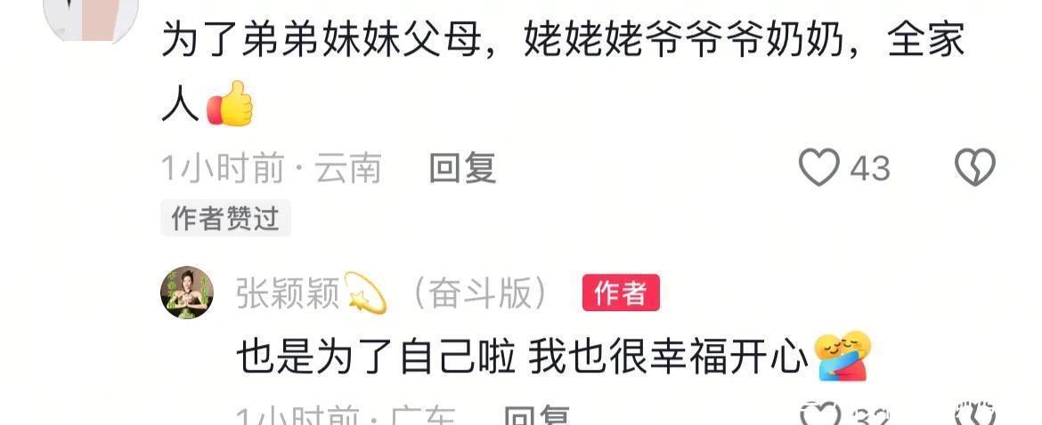 网友嗟叹地说:有颖颖这么的姐姐真幸福,还有网友说:为了弟弟妹妹父母,姥爷姥姥爷爷奶奶,全家东说念主真横蛮!张颖颖暗意亦然为了我方,当今她亦然幸福抖擞!