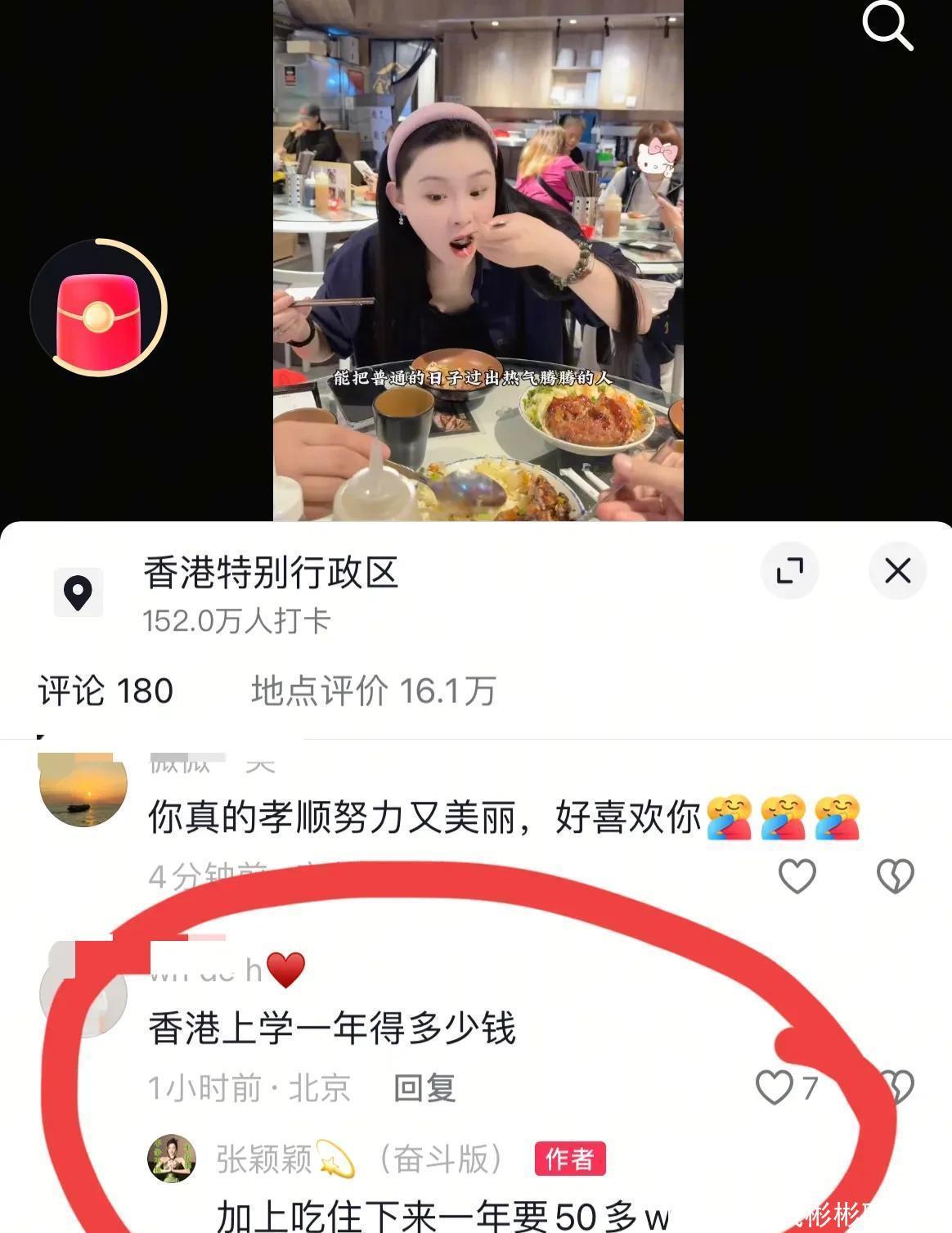 有网友问张颖颖妹妹在香港上学一年的用度?张颖颖回报:吃住下来一年50多w!