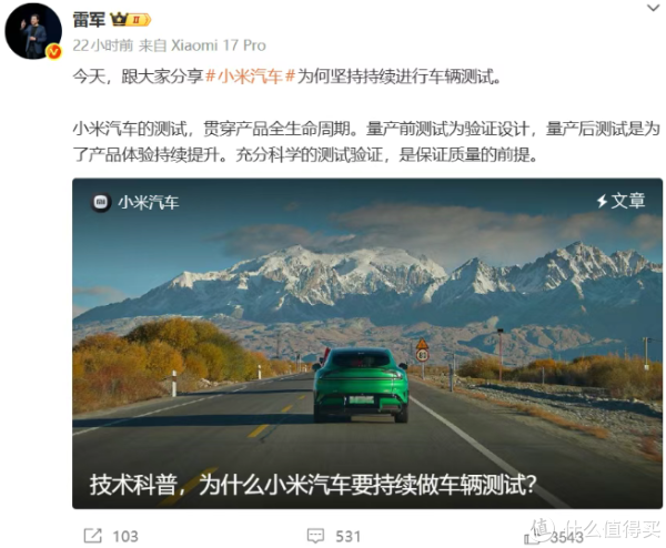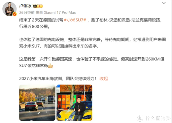 11月6日晚,小米集团搭伙东说念主、总裁卢伟冰微博发文称:竣事了2天在德国的试驾小米SU7,跑了柏林-汉堡和汉堡-法兰克福两段路,行程近800公里。