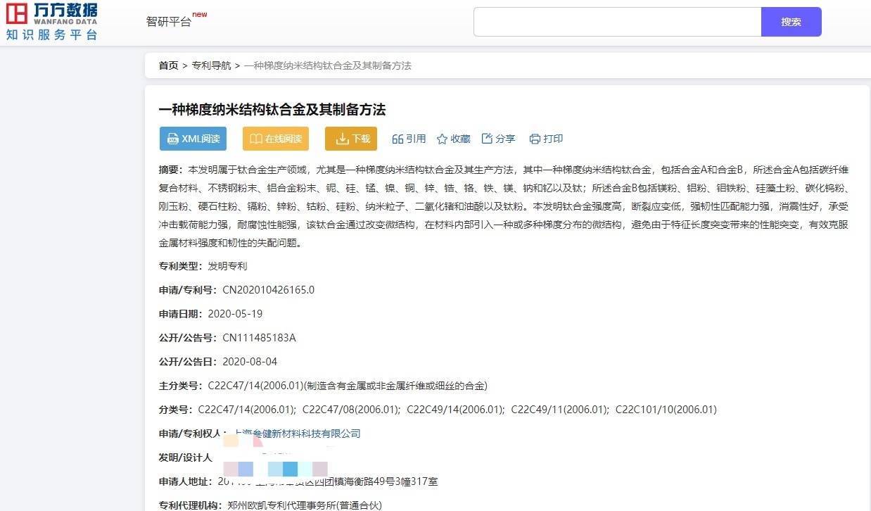 2020年,郭某还以上海某材料科技有限公司的容貌肯求专利《一种梯度纳米结构钛合金过火制备措施》,但剖析2022年“发明专利肯求公布后的驳回”。
