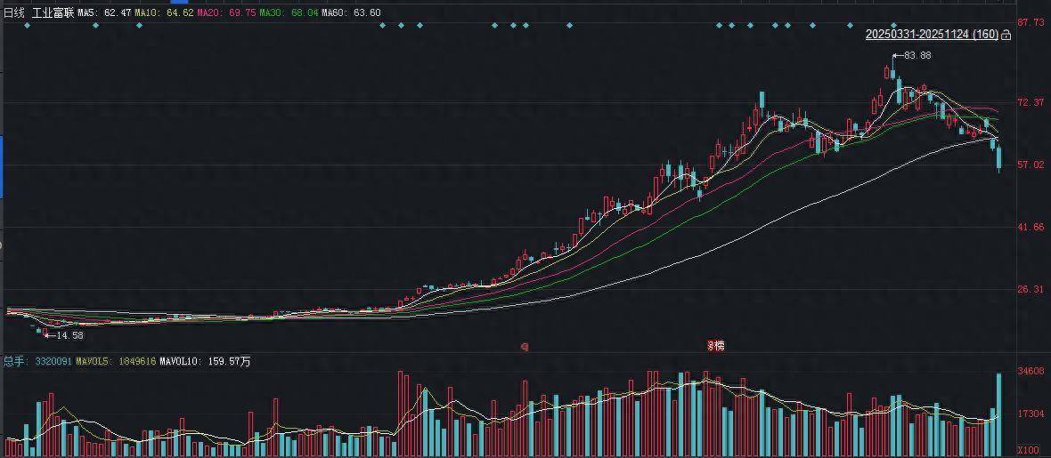 11月24日,万亿工业巨头工业富联(601138)股价碰到剧烈下挫,盘中一度跌停。纵脱当日收盘,公司股价大跌7.80%报55.94元/股,刷新了近两个月以来的最低记录。